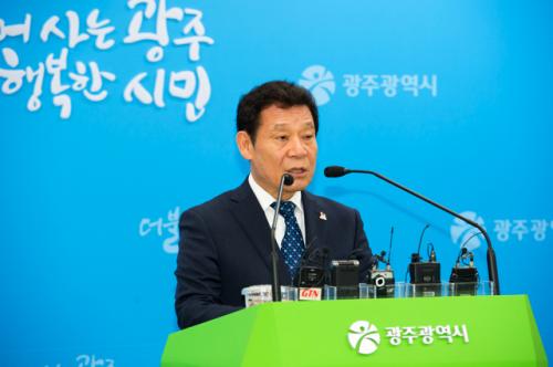 [±¤ÁÖ=¹Ìµð¾îÀü³²]¹ÚÂù ±âÀÚ=15ÀÏ ¿ÀÀü ±¤ÁÖ±¤¿ª½Ãû 5Ãþ ºê¸®ÇÊ ·ë¿¡¼ ½Ã¹ÎÂü¿©¿Í ¼ÒÅëÀ» À§ÇØ 1ÀÏ ½Ã¹Î½ÃÀåÀ¸·Î ¼±¹ßµÈ ¾ç¼Áø ¾¾¸¦ À±ÀåÇö ±¤ÁÖ½ÃÀåÀÌ ÃëÀçÁøµé¿¡°Ô Àλ縦 ½Ã۰í ÀÖ´Ù. À̳¯ ¾ç ¾¾´Â À¯´Ï¹ö½Ã¾Æµå D-200ÀÏÀ» ¸Â¾Æ À±¡¦
