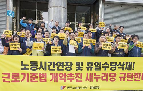 [Æ÷Åä´º½º=¹Ìµð¾îÀü³²]¹ÚÂù ±âÀÚ = ¹ÎÁÖ³ëÃÑ ±¤ÁÖ¡¤Àü³²º»ºÎ´Â ±¤Áֽà ºÏ±¸ ÁßÈﵿ »õ´©¸®´ç»ç ¾Õ¿¡¼ 14ÀÏ ¿ÀÈÄ ±âÀÚȸ°ßÀ» °®°í ¡°»õ´©¸®´ç ±Ç¼±µ¿ ÀÇ¿ø µîÀÌ ¹ßÀÇÇÑ ±Ù·Î±âÁعý °³Á¤ ÀÔ¹ý¾ÈÀº ¹ý¿øÀÌ ÆÇ´ÜÇÑ ¿¬Àå³ëµ¿ Á¦Çѽð£À» ´Ã·Á¡¦