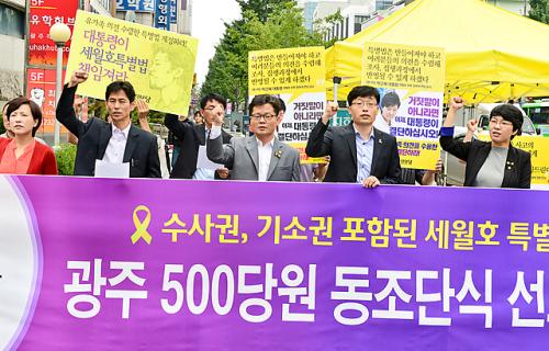 [±¤ÁÖ=¹Ìµð¾îÀü³²] ¹ÚÂù ±âÀÚ = 27ÀÏ ¿ÀÀü ÅëÇÕÁøº¸´ç ±¤ÁֽôçÀº ¼ö»ç±Ç°ú ±â¼Ò±ÇÀÌ º¸ÀåµÇ´Â ¼¼¿ùÈ£ Ưº°¹ýÁ¦Á¤À» Ã˱¸Çϰí À¯¹Î ¾Æºü¸¦ Áö۱â À§ÇØ ±¤Áֽôç 500¿© ´ç¿øµéÀÌ µ¿Á¶´Ü½Ä ¼±Æ÷ ±âÀÚȸ°ßÀ» ¿°í ´Ü½Ä¿¡ µé¾î°¬´Ù. ¡¦
