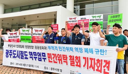 [±¤ÁÖ=¹Ìµð¾îÀü³²] ¹ÚÂù ±âÀÚ = 21ÀÏ ¿ÀÀü ±¤ÁÖ ½Ãû»ç ¾Õ¿¡¼ °ø°ø¿î¼ö³ëÁ¶ ±¤ÁÖÀü³²ÁöºÎ ³ëÁ¶¿øµéÀº "'±¤ÁÖµµ½Ãöµµ ¿ª¹«¾÷¹« ¹Î°£À§Å¹ öȸ¡¯ ±âÀÚȸ°ßÀ» ¿¬ µÚ ¹Î°£ À§Å¹À¸·Î ÀÎÇØ ¿ªÀå¼±¹ßºÎÅÍ ºñÁ¤±ÔÁ÷ ¿ª¹«¿øµéÀÇ ±Ù¹«È¯°æ, ¿ª°ü¡¦