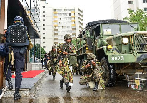 [±¤ÁÖ=¹Ìµð¾îÀü³²] ¹ÚÂù ±âÀÚ = 20ÀÏ ¿ÀÈÄ ¼±¸ ¾çµ¿ KDBºôµù(±¸.±ÝÈ£»ý¸í)¿¡¼ 2014 À»ÁöÈÆ·ÃÀÎ °íÃþ°Ç¹° ÈÀç ½ÇÁ¦´ëºñÈÆ·ÃÀÌ ¿¸° °¡¿îµ¥ ±º À庴µéÀÌ °Ç¹° °æ°è¿¡ ³ª¼°í ½Ã¹ÎµéÀº ÈÀ縦 ÇÇÇØ °Ç¹° ¹ÛÀ¸·Î ´ëÇÇÇϰí ÀÖ´Ù.