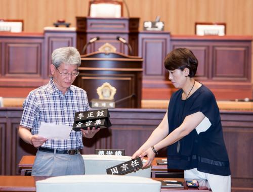 [±¤ÁÖ=¹Ìµð¾îÀü³²] ¹ÚÂù ±âÀÚ = 8ÀÏ ±¤ÁÖ±¤¿ª½ÃÀÇ¿ø °³¿øÀ» ¾ÕµÎ°í 7ÀÏ ¿ÀÈÄ ±¤ÁÖ±¤¿ª½Ã ½ÃÀÇȸ °ü°èÀÚµéÀÌ »õ·ÎÀÌ ¼±ÃâµÈ ½ÃÀÇ¿øµéÀÇ Á¼®¿¡ »õ ¸íÆÐ¸¦ ¹èÄ¡Çϰí ÀÖ´Ù.