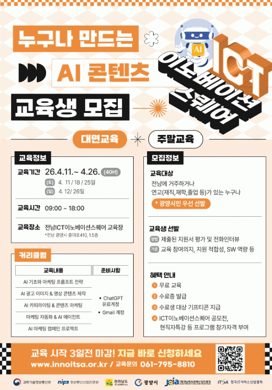 [¹Ìµð¾îÀü³² ÀÓ¼º¿Ï ±âÀÚ] ±¤¾ç½Ã´Â 3¿ù 16ÀϺÎÅÍ 4¿ù 8ÀϱîÁö ¡®´©±¸³ª ¸¸µå´Â AI ÄÜÅÙÃ÷¡¯ ±³À°»ýÀ» ¸ðÁýÇÑ´Ù°í ¹àÇû´Ù. À̹ø ±³À°Àº »ý¼ºÇü ÀΰøÁö´É(AI)À» Ȱ¿ëÇÑ ÄÜÅÙÃ÷ Á¦ÀÛ ¿ª·®À» ³ôÀ̱â À§ÇØ ¸¶·ÃµÆÀ¸¸ç, 4¿ù 11ÀϺÎÅÍ 4¿ù 26ÀÏ¡¦