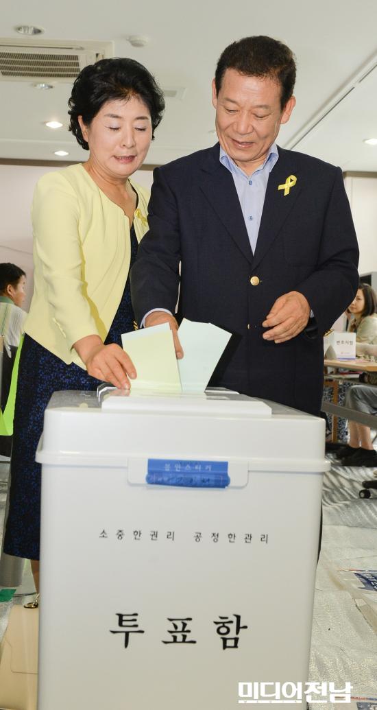 [±¤ÁÖ=¹Ìµð¾îÀü³²] ¹ÚÂù ±âÀÚ = 6¡¤4Áö¹æ¼±°Å ÅõÇ¥ÀÏÀÎ 4ÀÏ »õÁ¤Ä¡¹ÎÁÖ¿¬ÇÕ À±ÀåÇö ±¤ÁÖ½ÃÀå È帰¡ Çп Á¦1ÅõÇ¥¼Ò¿¡¼ ºÎÀΰú ÇÔ²² ÅõÇ¥ÇÔ¿¡ ÅõÇ¥¿ëÁö¸¦ ³Ö°í ÀÖ´Ù.