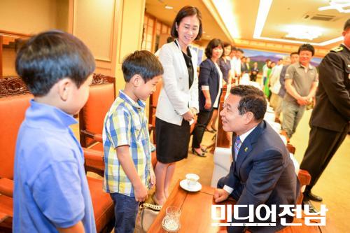[±¤ÁÖ=¹Ìµð¾îÀü³²] ¹ÚÂù ±âÀÚ = 1ÀÏ ¿ÀÀü ¹Î¼±6±â À±ÀåÇö ±¤ÁÖ½ÃÀåÀÌ ÃëÀÓ½ÄÀ» °®±â Àü ºê¸®ÇÎ ·ë¿¡¼ ÃëÀÓ ¼±¼½Ä¿¡ Âü°¡ÇÒ ½ÖµÕÀÌ ÇüÁ¦¿¡°Ô ¾ÈºÎ¸¦ ¹¯°í ´ã¼Ò¸¦ ³ª´©°í ÀÖ´Ù.