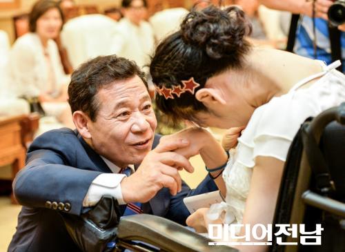 [±¤ÁÖ=¹Ìµð¾îÀü³²] ¹ÚÂù ±âÀÚ = 1ÀÏ ¿ÀÀü ¹Î¼±6±â À±ÀåÇö ±¤ÁÖ½ÃÀåÀÌ ÃëÀÓ½ÄÀ» °®±â Àü¿¡ ½Ãû ºê¸®Çη뿡¼ ÃëÀÓ ¼±¼¸¦ ÇÔ²² ÇÒ ½Ã¹Î Áß Àå¾ÖÀÎ ´ëÇ¥·Î Âü¼®ÇÑ ½Ã¹Î¿¡°Ô ±×°£ÀÇ ¾ÈºÎ¸¦ ¹°À¸¸ç ¹Ý±â°í ÀÖ´Ù.