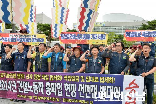 [±¤ÁÖ=¹Ìµð¾îÀü³²] ¹ÚÂù ±âÀÚ = ¹ÎÁÖ³ëÃÑ Àü±¹°Ç¼³³ëÁ¶ ±¤ÁÖ.Àü³²Áö¿ªº»ºÎ´Â 7ÀÏ ¿ÀÀü ±¤ÁÖ ½Ãû¾Õ¿¡¼ ¿À´Â22ÀÏ ÃÑÆÄ¾÷ ÅõÀï ½Â¸®¸¦ À§ÇÑ ÇöÀå¼±ÀüÀü ¹ß´ë½ÄÀ» °¡Á³´Ù.