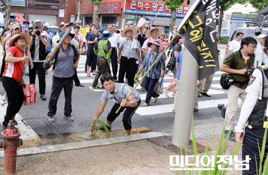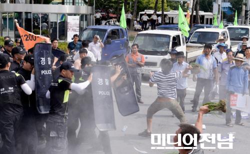 [±¤ÁÖ=¹Ìµð¾îÀü³²] ¹ÚÂù ±âÀÚ = 21ÀÏ ¿ÀÈÄ ±¤ÁÖ±¤¿ª½Ã ºÏ±¸ ±¤ÁÖ¿ª ±¤Àå¿¡¼ Àü±¹³ó¹ÎȸÃÑ¿¬¸Í ±¤ÁÖÀü³²¿¬¸Í 300¿©¸íÀÇ ³ó¹ÎµéÀº '½Ò Àü¸é°³¹æ Áß´Ü' 'ÇÑ.ÁßFTAÁß´Ü¡¯ Ã˱¸ Áýȸ¸¦ ¿°í ¡°½Ò Àü¸é°³¹æÀº ½Ä·®Âü»ç¸¦ °¡Á®¿Â´Ù¡±°í ÁÖÀåÇϸç Çã¼ö¾Æºñ¿¡ ºÒÀ» ºÙ¿© ÈÇü½ÄÀ» ÇÏÀÚ °æÂûµéÀÌ ¼Òȱ⸦ µé°í ÁøÈ¿¡ ³ª¼ÀÚ ³ó¹ÎµéÀÌ ¸ð¸¦ Áý¾î µé°í Ç×ÀǸ¦ Çϰí ÀÖ´Ù.