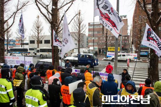 [±¤ÁÖ=¹Ìµð¾îÀü³²]¹ÚÂù ±âÀÚ=17ÀÏ ¿ÀÈÄ ±¤ÁÖ ºÏ±¸ ÁßÈﵿ »õ´©¸®´ç ±¤ÁÖ½Ã´ç ¾Õ¿¡¼ °ø¹«¿ø ³ëÁ¶´Â Áýȸ¸¦ °®°í ¡°»õ´©¸®´çÀÌ ´ç·ÐÀ¸·Î ¹ßÀÇÇÑ °ø¹«¿ø °øÀû¿¬±Ý¹ý °³Á¤¾ÈÀÌ °ø¹«¿øÀÇ ³ëÈĸ¦ ºÒ¾ÈÇÏ°Ô Çϰí ÀÖ´Ù¡±¸ç »õ´©¸®´çÀ» ±ÔźÇß´Ù.