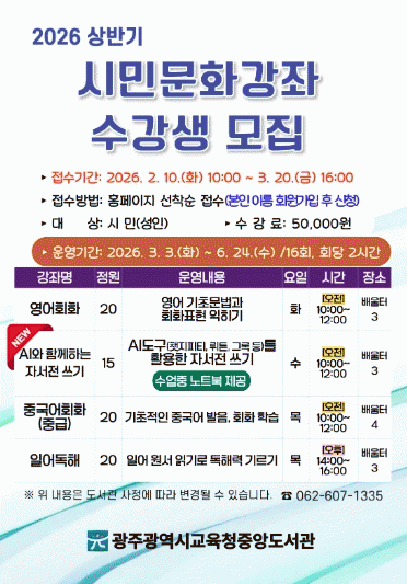 [¹Ìµð¾îÀü³² Á¦°¥´ëÁ¾ ±âÀÚ]±¤ÁÖ±¤¿ª½Ã±³À°Ã»Áß¾Óµµ¼°üÀº ¿À´Â 3¿ù 3ÀϺÎÅÍ 6¿ù 24ÀϱîÁö µµ¼°ü ¹è¿òÅÍ½Ç µî¿¡¼ ¡®2026³âµµ »ó¹Ý±â ½Ã¹Î¹®È°Á¡¯¸¦ ¿î¿µÇÑ´Ù. À̹ø °Á´ ½Ã¹Îµé¿¡°Ô ÀÚ±â°è¹ßÀÇ ±âȸ¸¦ Á¦°øÇØ ÀÏ»ó ¼Ó ¹è¿òÀÇ ¡¦