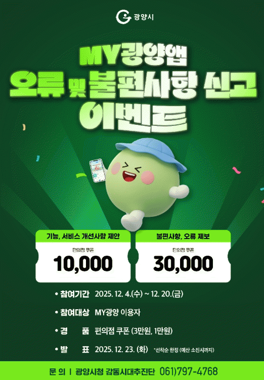 [¹Ìµð¾îÀü³² ÀÓ¼º¿Ï ±âÀÚ]±¤¾ç½Ã´Â 12¿ù 4ÀϺÎÅÍ 20ÀϱîÁö ¡®MY±¤¾ç ¾Û ¿À·ù¡¤°³¼± Á¦¾È À̺¥Æ®¡¯¸¦ ¿î¿µÇÑ´Ù°í ¹àÇû´Ù. ½Ã´Â Áö³ 5¿ù 22ÀÏ 'MY±¤¾ç' ¾Û Á¤½Ä ¿ÀÇ ÀÌÈÄ Áö¼ÓÀûÀ¸·Î ±â´É °³¼±À» ÃßÁøÇØ ¿ÔÀ¸¸ç, ¿À·ù¸¦ Á¦·ÎÈÇÏ°í »ç¿ë¡¦
