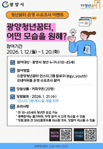 [¹Ìµð¾îÀü³² ÀÓ¼º¿Ï ±âÀÚ]±¤¾çû³â²ÞÅͰ¡ 1¿ù 12ÀϺÎÅÍ 20ÀϱîÁö ¡®±¤¾çû³â²ÞÅÍ, ¾î¶² ¸ð½ÀÀ» ¿øÇØ?¡¯¸¦ ÁÖÁ¦·Î 2026³â û³â²ÞÅÍ ¿î¿µÀ» À§ÇÑ ÇÁ·Î±×·¥ ¼ö¿äÁ¶»ç À̺¥Æ®¸¦ ÁøÇàÇÑ´Ù. À̹ø À̺¥Æ®´Â û³âµéÀÌ Á÷Á¢ Á¦¾ÈÇÏ´Â ±¤¾çû³â²ÞÅÍ¡¦