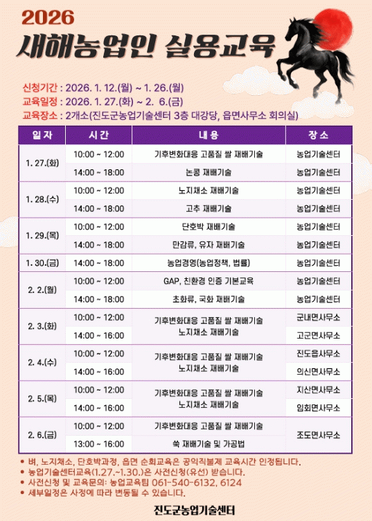 [¹Ìµð¾îÀü³² Á¦°¥´ëÁ¾ ±âÀÚ]°íǰÁú ½Ò Àç¹è±â¼ú, ³íÄá, ³ëÁöä¼Ò, ¸¸°¨·ù µî Àü¹® Àç¹è ±â¼ú, ³ó¾÷°æ¿µ ±³À° Áøµµ±ºÀº ¡®2026³âµµ »õÇØ ³ó¾÷ÀÎ ½Ç¿ë±³À°¡¯À» ¿À´Â 1¿ù 27ÀϺÎÅÍ 2¿ù 6ÀϱîÁö 2ÁÖ µ¿¾È Áøµµ±º³ó¾÷±â¼ú¼¾ÅÍ µî¿¡¼ ÁøÇàÇÑ´Ù¡¦