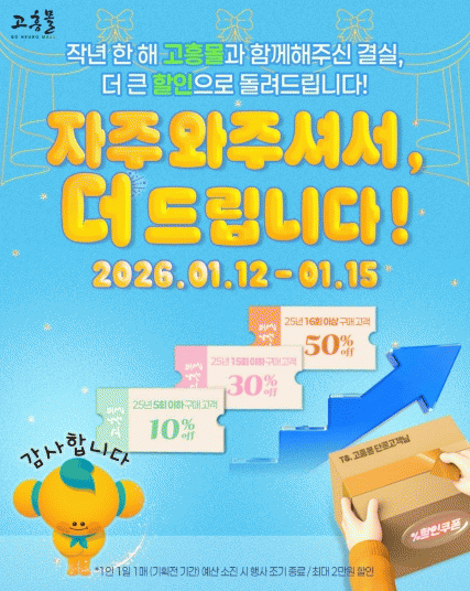 [¹Ìµð¾îÀü³² Á¦°¥´ëÁ¾ ±âÀÚ]°íÈﱺÀÌ ¿î¿µÇÏ´Â °ø½Ä ¿Â¶óÀÎ ¼îÇθô °íÈï¸ôÀÌ ¿À´Â 1¿ù 12ÀϺÎÅÍ 15ÀϱîÁö 4Àϰ£, ´Ü°ñ °í°´À» ´ë»óÀ¸·Î Ưº° ±âȹÀü ¡®ÀÚÁÖ ¿ÍÁּż, ´õ µå¸³´Ï´Ù¡¯¸¦ ÁøÇàÇÑ´Ù. À̹ø ±âȹÀüÀº 2025³â ¿¬°£ ÃÖ´ë ¸ÅÃâ ´Þ¡¦