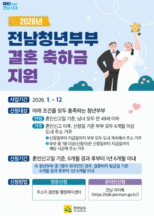 [¹Ìµð¾îÀü³² Á¦°¥´ëÁ¾ ±âÀÚ]Àü¶ó³²µµ´Â û³âºÎºÎÀÇ °áÈ¥ Ãʱ⠰æÁ¦Àû ºÎ´ã ¿ÏÈ¿Í Àü³² Áö¿ª Á¤Âø À¯µµ¸¦ À§ÇØ ¡®Ã»³âºÎºÎ °áÈ¥ÃàÇϱݡ¯ 200¸¸ ¿øÀ» Áö¿øÇÑ´Ù. û³âºÎºÎ °áÈ¥ÃàÇÏ±Ý Áö¿ø»ç¾÷Àº Àü³²µµ°¡ 2021³â Àü±¹ ±¤¿ª½Ã¡¤µµ ÃÖÃʷΡ¦