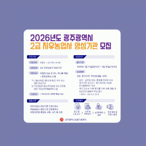 [¹Ìµð¾îÀü³² Á¦°¥´ëÁ¾ ±âÀÚ]±¤ÁÖ±¤¿ª½Ã ³ó¾÷±â¼ú¼¾ÅÍ´Â 12ÀϺÎÅÍ 30ÀϱîÁö ¡®2±Þ Ä¡À¯³ó¾÷»ç ¾ç¼º±â°ü¡¯ ÁöÁ¤À» À§ÇÑ ½ÅûÀ» ¹Þ´Â´Ù. 2±Þ Ä¡À¯³ó¾÷»ç ¾ç¼º±â°üÀº ±³À° À̼öÀÚ°¡ ÀڰݽÃÇèÀ» ÅëÇØ Ä¡À¯³ó¾÷»ç·Î Ȱµ¿ÇÒ ¼ö ÀÖµµ·Ï ±³À°Çϴ¡¦