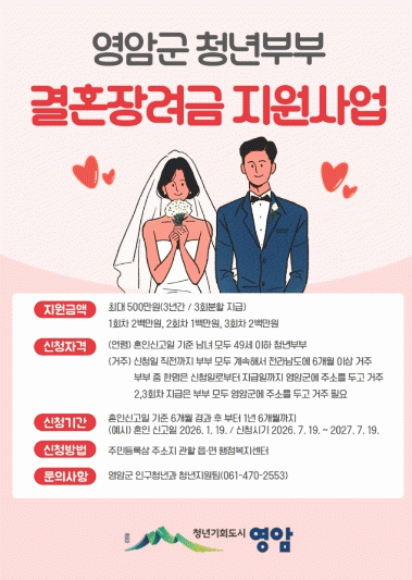 [¹Ìµð¾îÀü³² °í±Ô¼® ±âÀÚ]¿µ¾Ï±ºÀÌ Ã»³âºÎºÎ¿¡°Ô ÃÖ´ë 500¸¸¿øÀ» Áö¿øÇÑ´Ù. ¡®2026 û³âºÎºÎ °áÈ¥Àå·Á±Ý Áö¿ø»ç¾÷¡¯¿¡ µû¸¥ ÀÌ Áö¿øÀº, ½ÅÈ¥ºÎºÎ °æÁ¦ ºÎ´ã ¿ÏÈ, û³â Àα¸ À¯ÀÔ ¹× Áö¿ª Á¤ÂøÀ» À§ÇÑ °Í. °áÈ¥Àå·Á±ÝÀº 3³â°£ 3ȸ·Î ¡¦