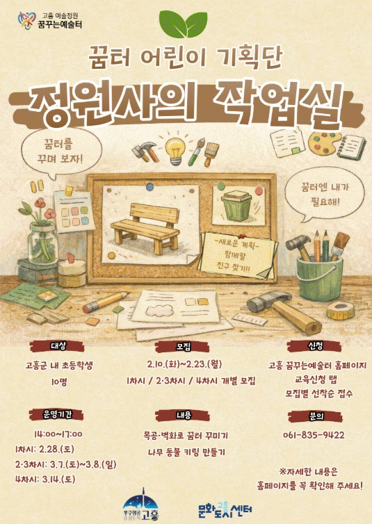 [¹Ìµð¾îÀü³² Á¦°¥´ëÁ¾ ±âÀÚ]°íÈﱺÀº ¿À´Â 2¿ù 10ÀϺÎÅÍ 23ÀϱîÁö ²ÞÅÍ ¾î¸°ÀÌ ±âȹ´Ü 'Á¤¿ø»çÀÇ ÀÛ¾÷½Ç'¿¡ Âü¿©ÇÒ Áö¿ª ³» ÃʵîÇлý 10¸íÀ» ¼±Âø¼øÀ¸·Î ¸ðÁýÇÑ´Ù°í ¹àÇû´Ù. 'Á¤¿ø»çÀÇ ÀÛ¾÷½Ç'Àº °íÈï ¿¹¼úÁ¤¿ø ²Þ²Ù´Â¿¹¼úÅÍÀÇ ÁÖ¿ä À̿롦