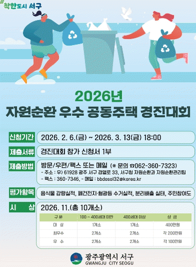 [¹Ìµð¾îÀü³² Á¦°¥´ëÁ¾ ±âÀÚ]±¤ÁÖ±¤¿ª½Ã ¼±¸°¡ °ü³» 100¼¼´ë ÀÌ»ó °øµ¿ÁÖÅà 204°³¼Ò¸¦ ´ë»óÀ¸·Î ¡®2026³â ÀÚ¿ø¼øÈ¯ ¿ì¼ö °øµ¿ÁÖÅà °æÁø´ëȸ¡¯¸¦ °³ÃÖÇÑ´Ù. ¼±¸´Â ¿Ã¹Ù¸¥ ºÐ¸®¹èÃâ°ú À½½Ä¹°¾²·¹±â °¨·® ¹®È Á¤ÂøÀ» À§ÇØ 2013³âºÎÅÍ °æÁø¡¦