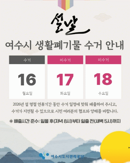 [¹Ìµð¾îÀü³² ÀüÇü¼º ±âÀÚ]¿©¼ö½Ãµµ½Ã°ü¸®°ø´Ü(ÀÌ»çÀå ¼Ûº´±¸)Àº 2026³â ¼³ ¸íÀýÀ» ¾ÕµÎ°í ±Í¼º°´°ú °ü±¤°´ÀÌ Áõ°¡ÇÒ °ÍÀ¸·Î ¿¹»óµÊ¿¡ µû¶ó, ÄèÀûÇÏ°í ±ú²ýÇÑ µµ½Ãȯ°æ Á¶¼ºÀ» À§ÇØ ¿©¼ö½Ã Àü¿ªÀ» ´ë»óÀ¸·Î '¼³ ¸íÀý ´ëºñ û¼ÒÁ¾ÇÕ ´ëÃ¥'À»¡¦