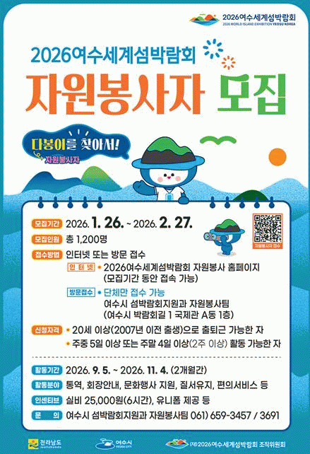 [¹Ìµð¾îÀü³² ÀüÇü¼º ±âÀÚ]¿©¼ö½Ã´Â 2026¿©¼ö¼¼°è¼¶¹Ú¶÷ȸ ¼º°øÀûÀÎ °³ÃÖ¸¦ À§ÇØ ÀÚ¿øºÀ»çÀÚ ´ÙºÀÀÌ(¡°´ÙÇÔ²² ºÀ»çÇÕ´Ï´Ù¡±)¸¦ ¸ðÁý ÁßÀÌ¸ç ½Ã¹Î Âü¿© È®´ë¸¦ À§ÇØ ¡°Ã£¾Æ°¡´Â ÀÚ¿øºÀ»ç ¸ðÁý ¼³¸íȸ¡±¸¦ ¿î¿µÇÒ °èȹÀÌ´Ù. ÀÚ¿øºÀ»çÀÚ(¡¦