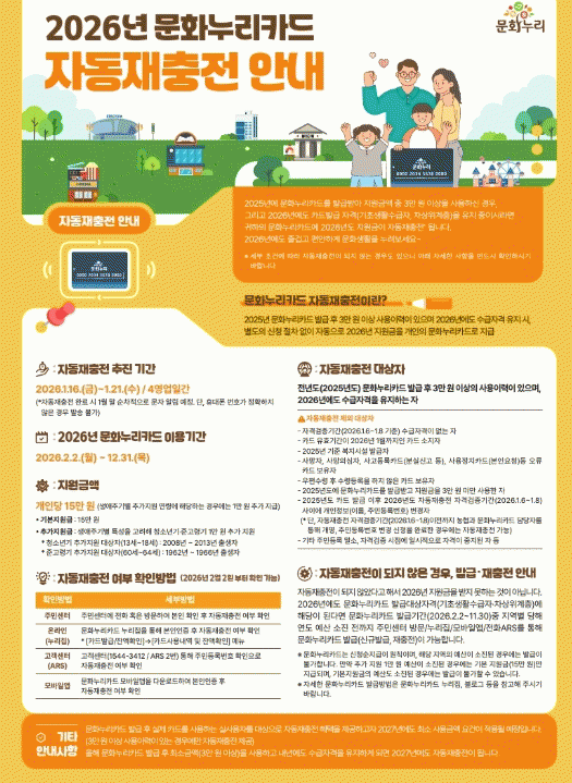 [¹Ìµð¾îÀü³² ±èÆÇ±¹ ±âÀÚ]¹«¾È±ºÀº ¹®È´©¸®Ä«µå(ÅëÇÕ¹®ÈÀÌ¿ë±Ç) ÀÌ¿ëÀÚ °¡¿îµ¥ ¼ö±Þ ÀÚ°ÝÀ» À¯ÁöÇÑ ´ë»óÀÚ¿¡°Ô º°µµÀÇ ½Åû ÀýÂ÷ ¾øÀÌ 2026³âµµ Áö¿ø±ÝÀ» ÀÚµ¿À¸·Î ÃæÀüÇØ ÁÖ´Â ¡®ÀÚµ¿ ÀçÃæÀü Á¦µµ¡¯¸¦ ½ÃÇàÇÑ´Ù°í ¹àÇû´Ù. ¹®È´©¸®Ä«¡¦