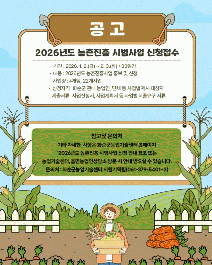 [¹Ìµð¾îÀü³² Á¦°¥´ëÁ¾ ±âÀÚ]ȼø±ºÀº ¡°¼ÒµæÀÌ ³ôÀº ºÎÀ¯ ³óÃÌ¡± ½ÇÇö°ú ȼø ³ó¾÷ °æÀï·Â °È¸¦ À§ÇØ ¡®2026³âµµ ³óÃÌÁøÈï ½Ã¹ü»ç¾÷¡¯ ½ÅûÀ» 2026³â 2¿ù 3ÀϱîÁö ½Åû¹Þ´Â´Ù°í ¹àÇû´Ù. À̹ø ³óÃÌÁøÈï ½Ã¹ü»ç¾÷Àº 4°³ºÐ¾ß(¿ª·®°³¹ß, ¡¦