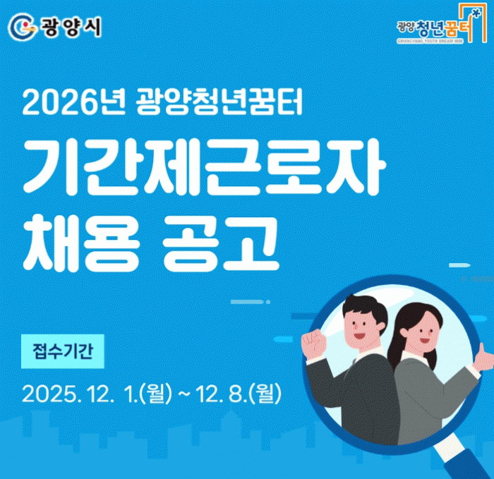 [¹Ìµð¾îÀü³² ÀÓ¼º¿Ï ±âÀÚ]±¤¾ç½Ã´Â 2026³â ÇÑ ÇØ µ¿¾È ±¤¾çû³â²ÞÅÍ ¿î¿µÀ» ÇÔ²²ÇÒ ±â°£Á¦±Ù·ÎÀÚ 4¸íÀ» ¸ðÁýÇÑ´Ù°í 1ÀÏ ¹àÇû´Ù. ä¿ëÀοøÀº ¡ã¼¾ÅÍÀå 1¸í ¡ã¸Å´ÏÀú 3¸í µî ÃÑ 4¸íÀÌ´Ù. ¼¾ÅÍÀåÀº ¿î¿µ ÃѰý°ú »ç¾÷°èȹ ¼ö¸³, ÇÁ·Î±×·¥ ±â¡¦