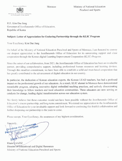 [¹Ìµð¾îÀü³² °í±Ô¼® ±âÀÚ]Àü¶ó³²µµ±³À°Ã»Àº ±³À° Á¤º¸È Áö¿ø »ç¾÷°ú °ü·ÃÇØ ¸ð·ÎÄÚ ±³À°ºÎ·ÎºÎÅÍ °ø½Ä °¨»ç ¼ÇÑÀ» ¹Þ°í, ±¹Á¦±³À° Çù·ÂÀÇ ½Å·Ú¿Í ¼º°ú¸¦ ´Ù½Ã Çѹø È®ÀÎÇß´Ù. À̹ø °¨»ç ¼ÇÑÀº Àü¶ó³²µµ±³À°Ã»ÀÌ 2021³âºÎÅÍ ±³À° Á¤º¸¡¦