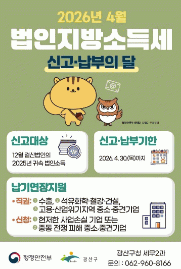 [¹Ìµð¾îÀü³² Á¦°¥´ëÁ¾ ±âÀÚ]±¤ÁÖ ±¤»ê±¸°¡ Áö¿ª ³» »ç¾÷ÀåÀ» µÐ ¹ýÀÎÀ» ´ë»óÀ¸·Î 2025³â ±Í¼Ó ¹ýÀÎÁö¹æ¼Òµæ¼¼ È®Á¤½Å°í ±â°£À» 30ÀϱîÁö ¿î¿µÇÑ´Ù. ½Å°í´ë»óÀº Áö³ÇØ 12¿ù °á»ê ¹ýÀÎÀÇ ¹ýÀμҵæÀ̸ç, »ç¾÷¿¬µµ Á¾·áÀϷκÎÅÍ 4°³¿ù À̳»¡¦