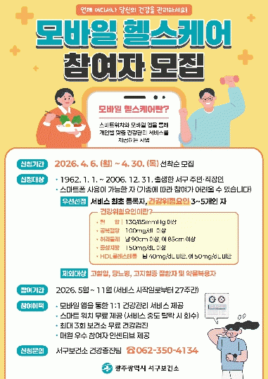 [¹Ìµð¾îÀü³² Á¦°¥´ëÁ¾ ±âÀÚ]±¤ÁÖ±¤¿ª½Ã ¼±¸°¡ Áö¿ªÁÖ¹ÎÀÇ °Ç°°ü¸® ¿ª·® °È¸¦ À§ÇØ Á¤º¸Åë½Å±â¼ú(ICT)À» Ȱ¿ëÇÑ °Ç°°ü¸® ¼ºñ½º ¡®¸ð¹ÙÀÏ ÇコÄɾ Âü¿©ÀÚ 125¸íÀ» ¿À´Â 30ÀϱîÁö ¼±Âø¼ø ¸ðÁýÇÑ´Ù. ¸ð¹ÙÀÏ ÇコÄÉ¾î »ç¾÷Àº °£È£»ç¡¦