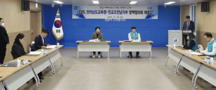 [¹Ìµð¾îÀü³² °í±Ô¼® ±âÀÚ]Àü¶ó³²µµ±³À°Ã»°ú Àü±¹±³Á÷¿ø³ëµ¿Á¶ÇÕ Àü³²ÁöºÎ´Â 28ÀÏ Àü¶ó³²µµ±³À°Ã» ÁßȸÀǽǿ¡¼ ³ë»ç ¾çÃø °ü°èÀÚµéÀÌ Âü¼®ÇÑ °¡¿îµ¥ ¡®2025³â Á¤Ã¥ÇùÀÇȸ ü°á½Ä¡¯À» °¡Á³´Ù. ³ë¡¤»ç ¾çÃøÀº À̹ø Á¤Ã¥ÇùÀǸ¦ ÅëÇØ ¡ã Àú¡¦