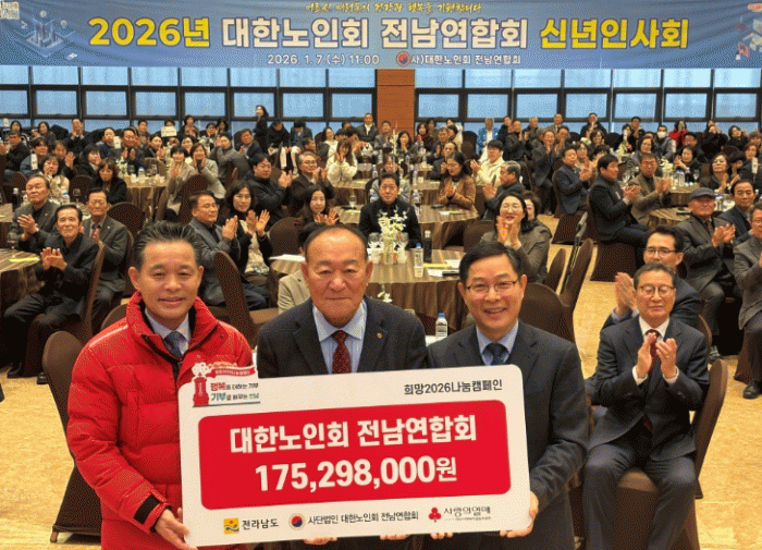[¹Ìµð¾îÀü³² Á¦°¥´ëÁ¾ ±âÀÚ]Àü¶ó³²µµ´Â ´ëÇѳëÀÎȸ Àü³²¿¬ÇÕȸ°¡ »çȸº¹Áö°øµ¿¸ð±Ýȸ¿¡ ÀÌ¿ô»ç¶û ¼º±Ý 1¾ï 7õ500¸¸ ¿øÀ» ±âŹÇß´Ù°í ¹àÇû´Ù. 7ÀÏ ¹«¾È ½ºÄ«ÀÌ¿þµùÄÁº¥¼Ç¿¡¼ ¿¸° 2026³â ´ëÇѳëÀÎȸ Àü³²¿¬ÇÕȸ ½Å³âÀλçȸ¿¡¼ ÁøÇàµÈ ¡¦