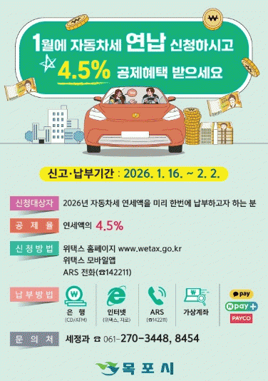 [¹Ìµð¾îÀü³² °í±Ô¼® ±âÀÚ]¸ñÆ÷½Ã´Â 1³âÄ¡ ÀÚµ¿Â÷¼¼¸¦ 1¿ù¿¡ ¹Ì¸® ³³ºÎÇÏ¸é ¼¼¾× °øÁ¦ ÇýÅÃÀ» ¹ÞÀ» ¼ö ÀÖ´Â ¡®ÀÚµ¿Â÷¼¼ ¿¬³³Á¦µµ¡¯¸¦ ÇÑ ´Þ°£ ¿î¿µÇÑ´Ù°í ¹àÇû´Ù. ÀÚµ¿Â÷¼¼ ¿¬³³Á¦µµ´Â ¸Å³â 6¿ù°ú 12¿ù¿¡ µÎ Â÷·Ê ³³ºÎÇÏ´Â ÀÚµ¿Â÷¼¼¸¦ 1¿ù¡¦