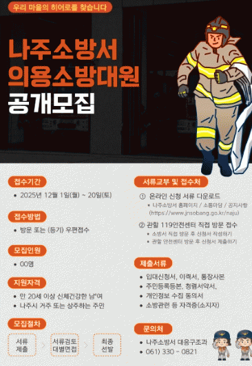 [¹Ìµð¾îÀü³² Á¦°¥´ëÁ¾ ±âÀÚ]³ªÁּҹ漴 Áö¿ª»çȸÀÇ ¾ÈÀüÀ» Ã¥ÀÓÁú ¡°2025³â ÇϹݱâ ÀÇ¿ë¼Ò¹æ´ë ½Å±Ô´ë¿ø ¸ðÁý¡±¿¡ ³ª¼±´Ù. ¸ðÁý ±â°£Àº ¿À´Â 12¿ù 1ÀϺÎÅÍ 20ÀϱîÁöÀ̸ç, ½Åõ¼·ù´Â ³ªÁÖ¼Ò¹æ¼ È¨ÆäÀÌÁö ¶Ç´Â ³ªÁּҹ漸¦ ºñ·ÔÇÑ 119¡¦