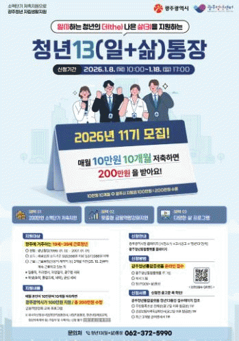 [¹Ìµð¾îÀü³² Á¦°¥´ëÁ¾ ±âÀÚ]±¤ÁÖ±¤¿ª½Ã´Â ÀÏ(1)Çϴ û³âÀÇ ´õ ³ªÀº »î(3)À» Áö¿øÇÏ´Â ¡®Ã»³â13(ÀÏ+»î)ÅëÀ塯 Á¦11±â Âü¿©ÀÚ¸¦ 8ÀϺÎÅÍ 18ÀϱîÁö ¸ðÁýÇÑ´Ù. ¡®Ã»³â13ÅëÀ塯Àº 19~39¼¼ ±Ù·Îû³âÀÌ ¸Å¿ù 10¸¸¿ø¾¿ 10°³¿ù°£ 100¸¸¿øÀ» ÀúÃࡦ
