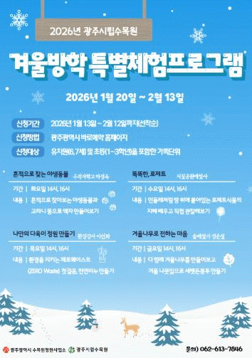 [¹Ìµð¾îÀü³² Á¦°¥´ëÁ¾ ±âÀÚ]±¤ÁÖ±¤¿ª½Ã ½Ã¸³¼ö¸ñ¿øÀº ¾î¸°À̸¦ À§ÇÑ ¡®2026³â °Ü¿ï¹æÇРüÇè ÇÁ·Î±×·¥¡¯ Âü°¡ÀÚ 640¸íÀ» ¿À´Â 13ÀÏ ¿ÀÀü 10½ÃºÎÅÍ ¼±Âø¼ø ¸ðÁýÇÑ´Ù. Âü°¡ ½ÅûÀº ±¤Áֽà ´©¸®ÁýÀ» ÅëÇØ Á¢¼öÇϸç, Á¤¿øÀÌ ³²À¸¸é ´çÀÏ ÇöÀ塦