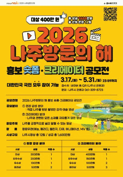[¹Ìµð¾îÀü³² Á¦°¥´ëÁ¾ ±âÀÚ]Àü³² ³ªÁֽð¡ ¼ôÆû ¿µ»ó ÄÜÅÙÃ÷ °ø¸ðÀüÀ» ÅëÇØ ¡®2026 ³ªÁֹ湮ÀÇ ÇØ¡¯ ÃàÁ¦¿Í ¹®È, °ü±¤ÀÚ¿øÀ» Àü±¹¿¡ ³Î¸® ¾Ë¸®´Â È«º¸¿¡ ³ª¼±´Ù. ³ªÁֽô ¿À´Â 5¿ù 31ÀϱîÁö ³ªÁÖÀÇ ´Ù¾çÇÑ ¸Å·ÂÀ» ¿µ»óÀ¸·Î ´ã¾Æ³¾ ¡®2¡¦