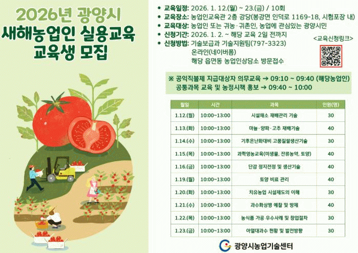 [¹Ìµð¾îÀü³² ÀÓ¼º¿Ï ±âÀÚ]±¤¾ç½Ã´Â 1¿ù 12ÀϺÎÅÍ 1¿ù 23ÀϱîÁö¡®2026³â »õÇØ³ó¾÷ÀÎ ½Ç¿ë±³À°¡¯À» ½Ç½ÃÇÑ´Ù°í ¹àÇû´Ù. »õÇØ³ó¾÷ÀÎ ½Ç¿ë±³À°Àº ³ó¾÷Á¤Ã¥°ú ¿¬°èÇÑ ±³À°À» ÅëÇØ °ü³» ³ó¾÷ÀÎÀÇ »õÇØ ¿µ³ó°èȹÀ» ¼ö¸³À» Áö¿øÇϰí, ÀÛ¹°º° Àç¹è¡¦