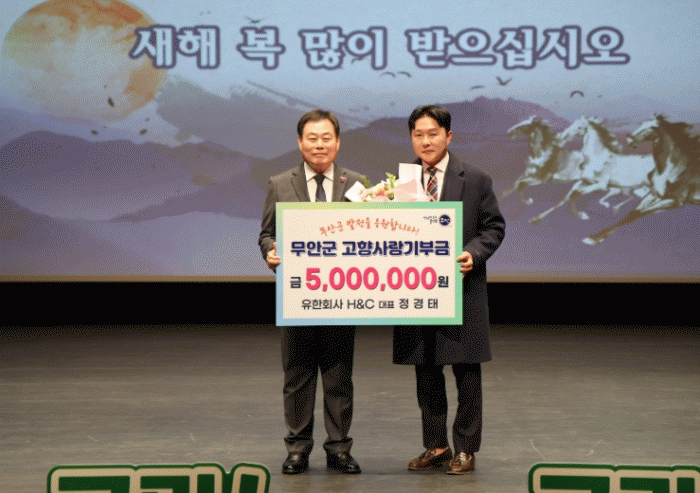 [¹Ìµð¾îÀü³² ±èÆÇ±¹ ±âÀÚ]¹«¾È±ºÀº Áö³ 5ÀÏ Çâ¿ì ±â¾÷ÀÎ À¯ÇÑȸ»ç H¡¤C Á¤°æÅ ´ëÇ¥°¡ 2026³â ¹«¾È±º °íÇâ»ç¶û±âºÎÁ¦ Á¦1È£ ±âºÎÀÚ·Î ³ª¼ 500¸¸ ¿øÀ» ±âŹÇß´Ù°í ¹àÇû´Ù. Á¤°æÅ ´ëÇ¥´Â 2023³â °íÇâ»ç¶û±âºÎÁ¦ ½ÃÇà ÀÌÈÄ ¸Å³â ¹«¾È±º ¡¦