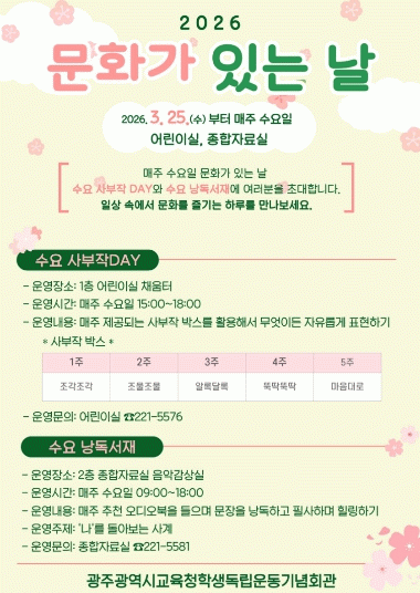[¹Ìµð¾îÀü³² Á¦°¥´ëÁ¾ ±âÀÚ]±¤Áֽñ³À°Ã»Çлýµ¶¸³¿îµ¿±â³äȸ°üÀº ¿À´Â 25ÀϺÎÅÍ ¸ÅÁÖ ¼ö¿äÀÏ ¿À°¨ üÇèÇü ¹®È Çà»ç ¡®¹®È°¡ ÀÖ´Â ³¯¡¯À» ¿î¿µÇÑ´Ù. À̹ø ÇÁ·Î±×·¥Àº ½Ã¹Î°ú ¾î¸°À̵éÀÌ ´Ùä·Î¿î µ¶¼¹®È Ȱµ¿À» üÇèÇϸç ÀÏ»ó ¼Ó¿¡¼¡¦