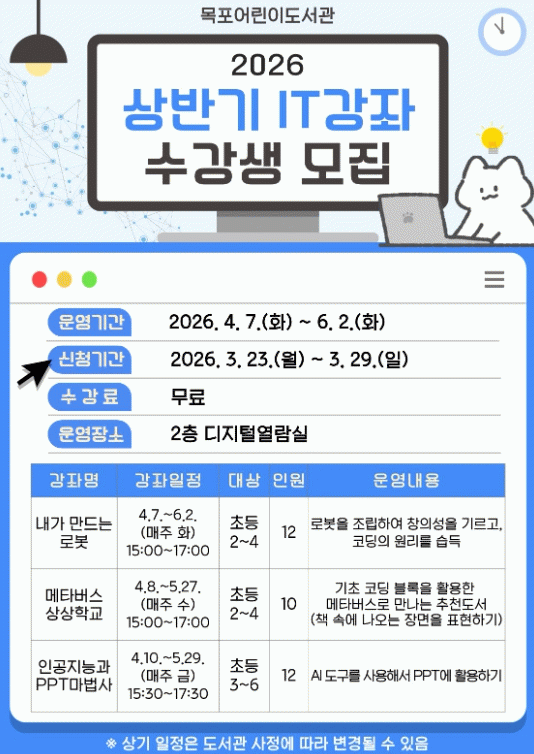 [¹Ìµð¾îÀü³² °í±Ô¼® ±âÀÚ] ¸ñÆ÷¾î¸°À̵µ¼°üÀº ¿À´Â 4¿ùºÎÅÍ Áö¿ª ¾î¸°À̵éÀÇ µðÁöÅÐ ¿ª·® °È¸¦ À§ÇÑ ¡®2026³â »ó¹Ý±â IT°Á¡¯¸¦ ¹«·á·Î ¿î¿µÇÑ´Ù. À̹ø °Á´ ¡ã³»°¡ ¸¸µå´Â ·Îº¿(Ãʵî 2~4Çгâ) ¡ã¸ÞŸ¹ö½º »ó»óÇб³(Ãʵî 2~4Çгâ)¡¦