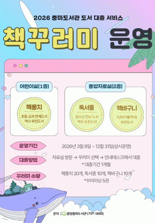 [¹Ìµð¾îÀü³² ÀÓ¼º¿Ï ±âÀÚ] ±¤¾çÁ߸¶µµ¼°üÀº ½Ã¹ÎµéÀÇ µ¶¼È°µ¿À» Áö¿øÇϰí Áö¿ª»çȸ¿¡ Ã¥ Àд ¹®È¸¦ È®»êÇϱâ À§ÇØ Áö³ÇØ¿¡ ÀÌ¾î ¡®¸ÂÃãÇü Ã¥ ²Ù·¯¹Ì¡¯ ¼ºñ½º¸¦ ¿î¿µÇÑ´Ù. ÇØ´ç ¼ºñ½º´Â ¿¬·Éº°¡¤ÁÖÁ¦º°·Î ±¸¼ºµÈ µµ¼¸¦ ²Ù·¯¹Ì Çü¡¦