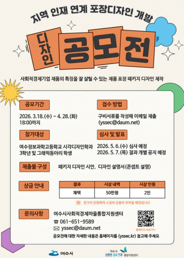[¹Ìµð¾îÀü³² ÀüÇü¼º ±âÀÚ]¿©¼ö½Ã´Â °ü³» »çȸÀû°æÁ¦±â¾÷ Á¦Ç°ÀÇ ºê·£µå °æÀï·Â °È¸¦ À§ÇØ ¡®Áö¿ª ÀÎÀç ¿¬°è Æ÷ÀåµðÀÚÀÎ °³¹ß °ø¸ðÀü¡¯À» º»°Ý ÃßÁøÇÑ´Ù°í ¹àÇû´Ù. À̹ø »ç¾÷Àº »çȸÀû°æÁ¦±â¾÷ Á¦Ç°ÀÇ Æ÷ÀåµðÀÚÀÎÀ» °³¼±ÇØ »óǰ °æÀï·Â¡¦
