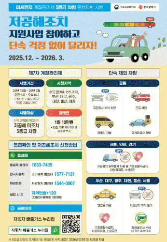 [¹Ìµð¾îÀü³² Á¦°¥´ëÁ¾ ±âÀÚ]±¤ÁÖ±¤¿ª½Ã´Â 12¿ù1ÀϺÎÅÍ ³»³â 3¿ù31ÀϱîÁö 4°³¿ù°£ ¡®Á¦7Â÷ ¹Ì¼¼¸ÕÁö °èÀý°ü¸®±â°£¡¯À¸·Î ¿î¿µ, Àú°øÇØ Á¶Ä¡¸¦ ÇÏÁö ¾ÊÀº ¹èÃâ°¡½º 5µî±Þ Â÷·®ÀÇ ¿îÇàÀ» Á¦ÇÑÇÑ´Ù. ¡®¹Ì¼¼¸ÕÁö °èÀý°ü¸®Á¦¡¯´Â °í³óµµ ¹Ì¼¼¸Õ¡¦