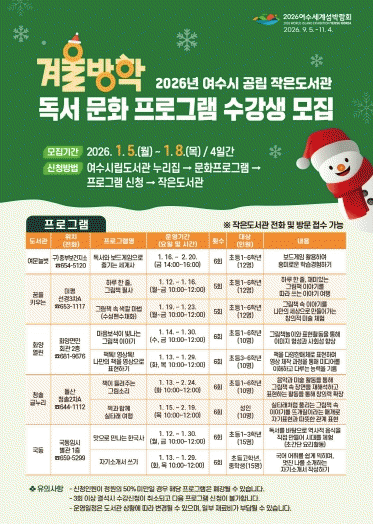 [¹Ìµð¾îÀü³² ÀüÇü¼º ±âÀÚ]¿©¼ö½Ã°¡ ¿î¿µÇÏ´Â 5°³ °ø¸³ ÀÛÀºµµ¼°ü¿¡¼ ¿À´Â 2026³â 1¿ù 5ÀϺÎÅÍ 8ÀϱîÁö ¡®°Ü¿ï¹æÇÐ µ¶¼¹®È ÇÁ·Î±×·¥¡¯ ¼ö°»ý 106¸íÀ» ¼±Âø¼ø ¸ðÁýÇÑ´Ù. À̹ø ÇÁ·Î±×·¥Àº ¹æÇÐÀ» ¸Â¾Æ Çлý°ú ¼ºÀÎÀ» ´ë»óÀ¸·Î µ¶¼¸¦ ¡¦