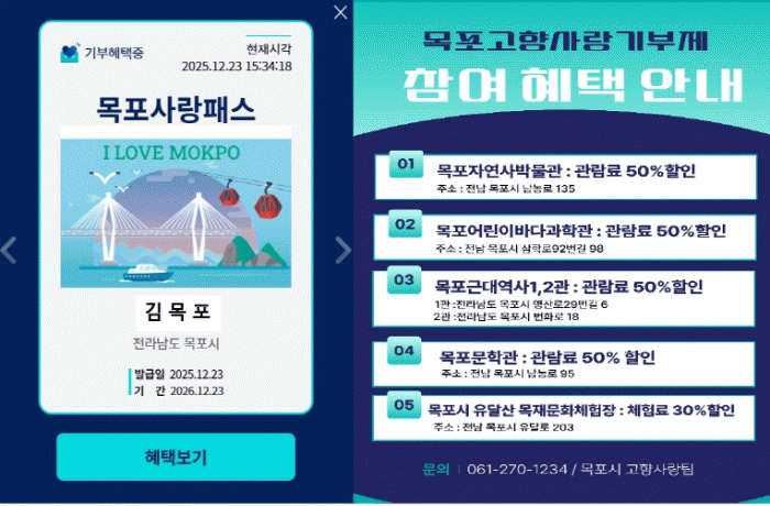 [¹Ìµð¾îÀü³² °í±Ô¼® ±âÀÚ]¸ñÆ÷½Ã´Â °íÇâ»ç¶û±âºÎÁ¦ Âü¿©ÀÚ¸¦ ´ë»óÀ¸·Î ¡®¸ñÆ÷»ç¶ûÆÐ½º¡¯¸¦ ¹ß±ÞÇÑ´Ù°í 30ÀÏ ¹àÇû´Ù. ¡®¸ñÆ÷»ç¶ûÆÐ½º¡¯´Â ¸ñÆ÷½Ã¿¡ 10¸¸ ¿ø ÀÌ»ó °íÇâ»ç¶û±âºÎ¸¦ Çϸé ÀÚµ¿À¸·Î ¹ß±ÞµÇ¸ç, °íÇâ»ç¶ûeÀ½ ´©¸®Áý ¸¶ÀÌÆäÀÌÁö¿¡¡¦