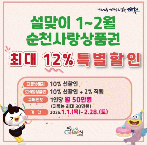 [¹Ìµð¾îÀü³² ÀÓ¼º¿Ï ±âÀÚ]¼øÃµ½Ã°¡ »õÇØ¿Í ¼³ ¸íÀýÀ» ¸Â¾Æ 2026³â 1¿ùºÎÅÍ 2¿ù±îÁö µÎ ´Þ°£ ¼øÃµ»ç¶û»óǰ±Ç ÇÒÀÎ Çà»ç¸¦ ÃßÁøÇØ Áö¿ª ¼Òºñ ÃËÁø¿¡ ³ª¼±´Ù°í ¹àÇû´Ù. Áö·ù»óǰ±ÇÀº ±¸¸Å ½Ã 10% ¼±ÇÒÀÎÀÌ Àû¿ëµÇ¸ç, ¸ð¹ÙÀÏ ¼øÃµ»ç¶û»óǰ±Ç¡¦