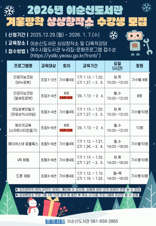 [¹Ìµð¾îÀü³² ÀüÇü¼º ±âÀÚ]¿©¼ö½Ã´Â 12¿ù 29ÀϺÎÅÍ 2026³â 1¿ù 7ÀϱîÁö ¡®2026³â À̼ø½Åµµ¼°ü °Ü¿ï¹æÇÐ »ó»óâÀÛ¼Ò¡¯ ¼ö°»ýÀ» ¼±Âø¼ø ¸ðÁýÇÑ´Ù. À̹ø ÇÁ·Î±×·¥Àº °ü³» ÃʵîÇлýÀ» ´ë»óÀ¸·Î ÇÏ´Â 7°³ °Á·Π±¸¼ºµÇ¸ç, 2026³â 1¿ù 12ÀϺΡ¦