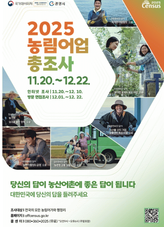 [¹Ìµð¾îÀü³² ÀÓ¼º¿Ï ±âÀÚ]±¤¾ç½Ã´Â 11¿ù 20ÀϺÎÅÍ 12¿ù 22ÀϱîÁö ¡®2025 ³ó¸²¾î¾÷ÃÑÁ¶»ç¡¯¸¦ ½Ç½ÃÇÑ´Ù°í ¹àÇû´Ù. ³ó¸²¾î¾÷ÃÑÁ¶»ç´Â ³ó¾÷¡¤ÀÓ¾÷¡¤¾î¾÷ÀÇ ±Ô¸ð¿Í ºÐÆ÷, ±¸Á¶ º¯È µîÀ» Á¾ÇÕÀûÀ¸·Î ÆÄ¾ÇÇØ Á¤Ã¥ ¼³°èÀÇ ±â¹ÝÀ» ¸¶·ÃÇÏ´Â ´ë±Ô¡¦